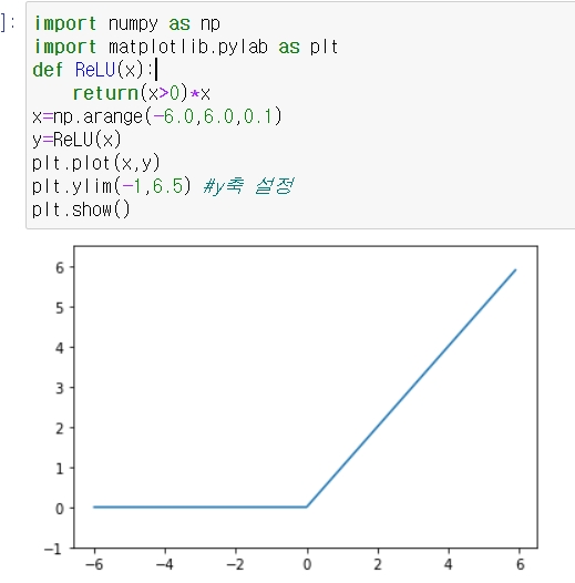 시그모이드 함수는 신경망 분야에서 오래전부터 이용했왔으나 최근에는 ReLU(Rectified Linear Unit) 함수를 주로 이용합니다.