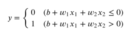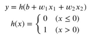 입력신호값이 가중치 값과 편향 값에 계산된 입력신호의 총합이 h(x)라는 함수를 거쳐 반환되어, 그 값이 0보다 크면 1을 출력하고 그렇지 않으면 0을 출력합니다.