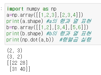 형식: np.dot(넘파이행렬변수1,넘파이행렬변수2)