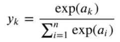 n은 출력층의 뉴런 수, k는 출력층의 뉴런의 k번째 출력임을 그리고 a는 소프트맥스 함수의 입력신호를 뜻합니다.