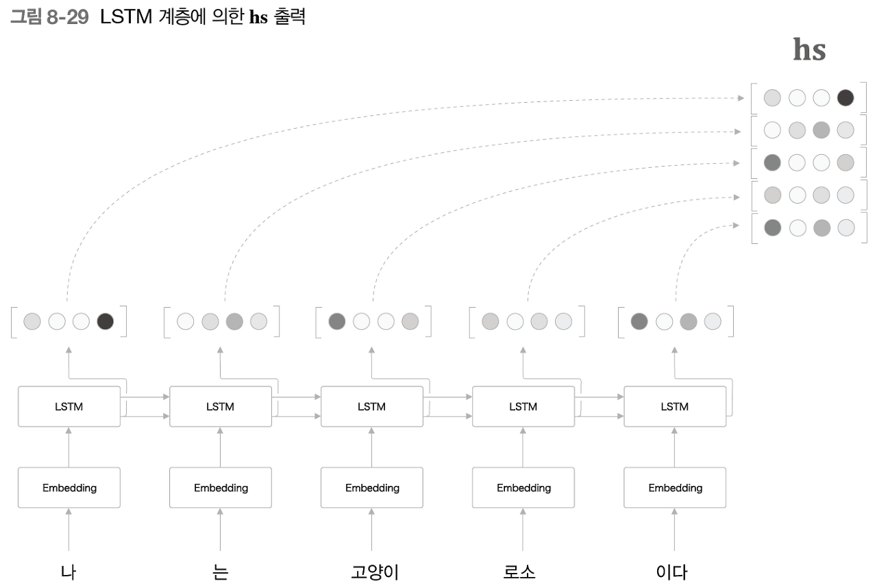 시각별 LSTM계층의 은닉 상태에는 직전에 입력된 단어에 대한 정보가 많이 포함되어 있을 것이기 때문에 각 단어의 문맥을 나타내는 벡터라고 생각할 수 있습니다.