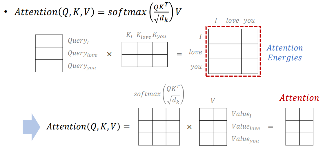 앞서 seq2seq에서 구현했던 것과 마찬가지로 중요도를 구하는 과정이 바로 query와 key의 내적 과정입니다.