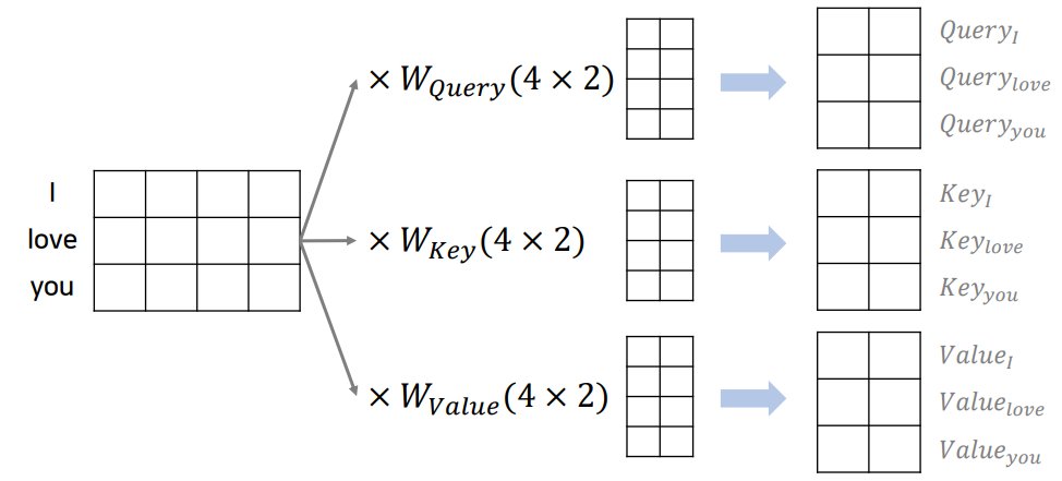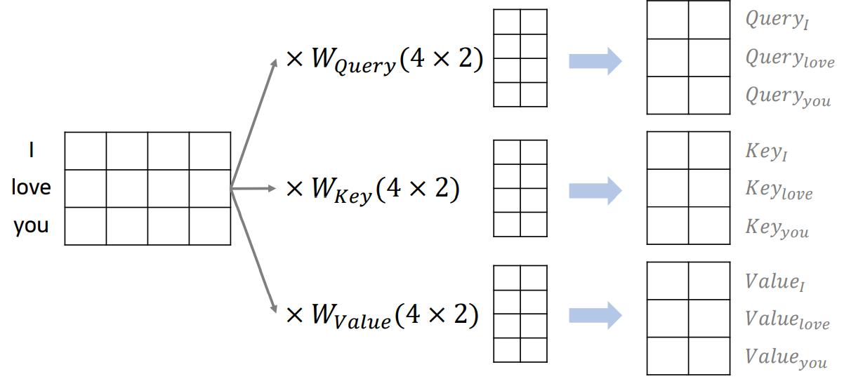 query, key, value가 결과 값으로 나오는데 각각에 대한 가중치 행렬들이 존재하게 되고,