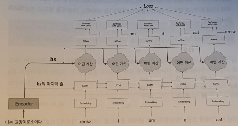 '어떤 계산'의 input은 Encoder로부터 받을 hs와 decoder의 각 LSTM의 시각별 계층의 은닉 상태입니다.