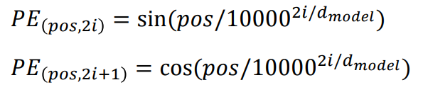 위치 정보에 대한 계산은 위와 같이 하며 cos과 sin을 사용한 이유는 문장의 길이마다 매 번 단순하게 값을 더하여 위치를 표현하는 것보다 고정적인 형태로 상대적 위치를 표현해주기 위함입니다.