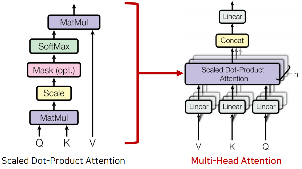 그런데 이름을 보면 Multi-head attention이고 그림을 봐도 head가 여러 개로 되어있는 attention인 것을 확인할 수 있습니다.