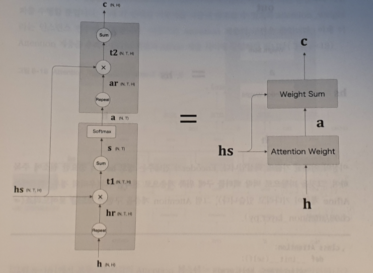 decoder의 LSTM계층의 은닉 상태 벡터(h)와 hs를 '어떤 계산'에 입력으로 사용된다고 앞서 말했습니다.