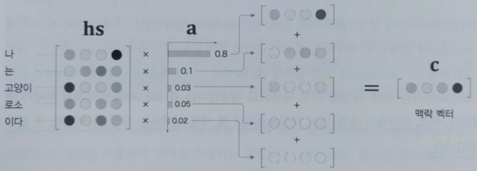 중요도가 구해지면 hs에 중요도(단일 원소)가 각 행에 스칼라곱을 하여 나온 결과의 행들의 합을 구하여 이를 맥락 벡터라고 합니다.