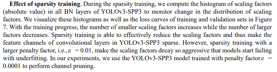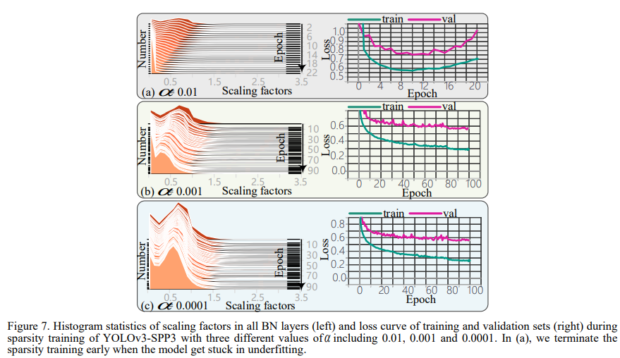 → Scaling factor의 분포의 변화와 YOLOv3-SPP3의 sparsity training 동안의 loss 그래프