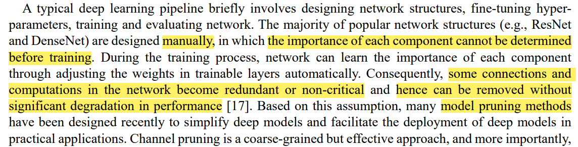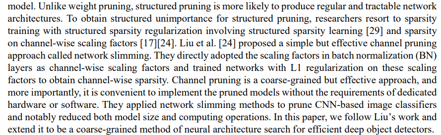 → 전문가에 의해 수동적으로 설계된 deep object detectors는 고유의 불필요한 중복성이 feature channels에 존재한다고 생각해서 parameter 크기와 FLOPS를 channel pruning으로 줄이려고 함