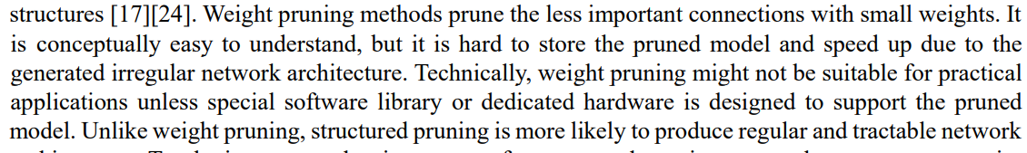→ 생성된 불규칙한 네트워크 구조 때문 - 기술적으로 weight pruning은 특별한 소프트웨어 라이브러리 혹은 그에 맞는 하드웨어가 pruned model을 지원하도록 설계되지 않는다면, 실제 applications에 적합하지 않을 수 있음