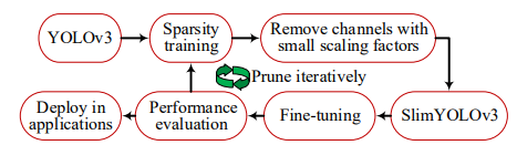 - channel pruning을 YOLOv3에 적용하여 SlimYOLOv3을 얻음