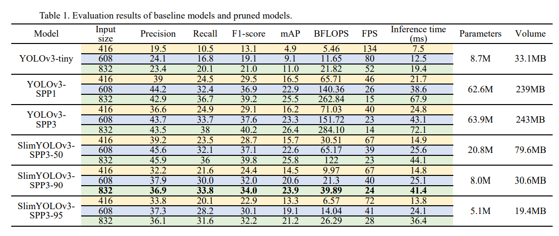 덜 중요한 feature channel을 제거함 - fewer trainable parameters와 FLOPS를 original YOLOv3와 비교하여 제시함