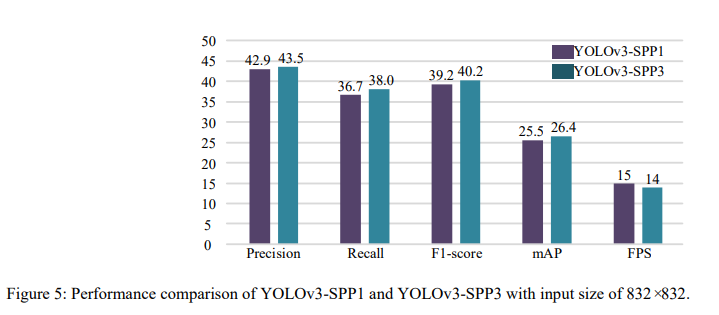 - 416x416, 608x608에 대해서 SPP3와 SPP1을 비교했을 때 detection performance가 성능 차이가 거의 안 났지만 더 큰 input인 832x832일 경우에 mAP와 F1-score에 대해서 차이가 outperforms 할 수 있는 것을 확인할 수 있음