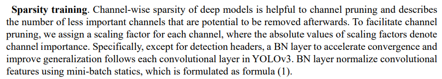 scaling factors을 각 channel마다 할당함 scaling factors의 절댓값이 channel의 중요도를 나타냄(denote)- detection header를 제외하고 BN layer는 YOLOv3의 각 convolution layer 후 적용