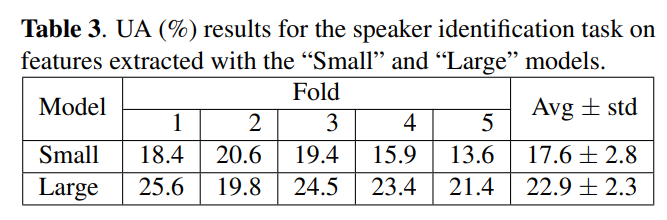 - Table3과 Table1의 결과를 전체적으로 볼 때, “Large” model과 비교했을 때, “Small” model로 부터 추출된 features가 더 나은 SER accuracy를 가지고 worse한 speaker identity accuracy를 보여줌