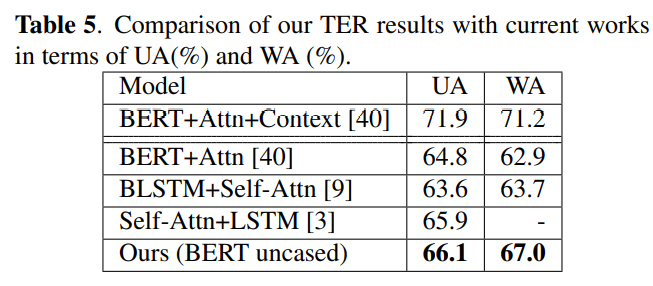 - 하지만 SER model과 달리, TER model의 ouput은 utterance-level emotion classification result를 나타냄