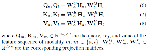 - audio와 text의 연관성을 학습하기 위해서, 먼저 각 feature sequence를 세 개의 관점인 query, key, value로 linear projection을 사용하여 변형시켜야 함