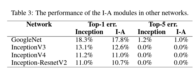 - I-A의 일반적 능력을 증명하기 위해, Down sampling 시 maxpooling을 사용하는 제안한 I-A module을 다른 모델들에 embed시킴