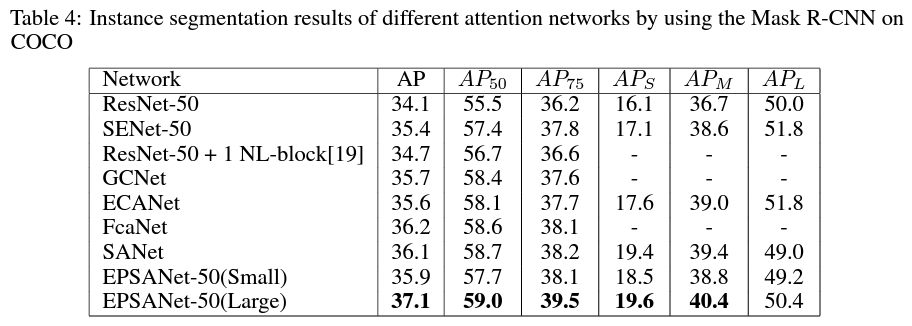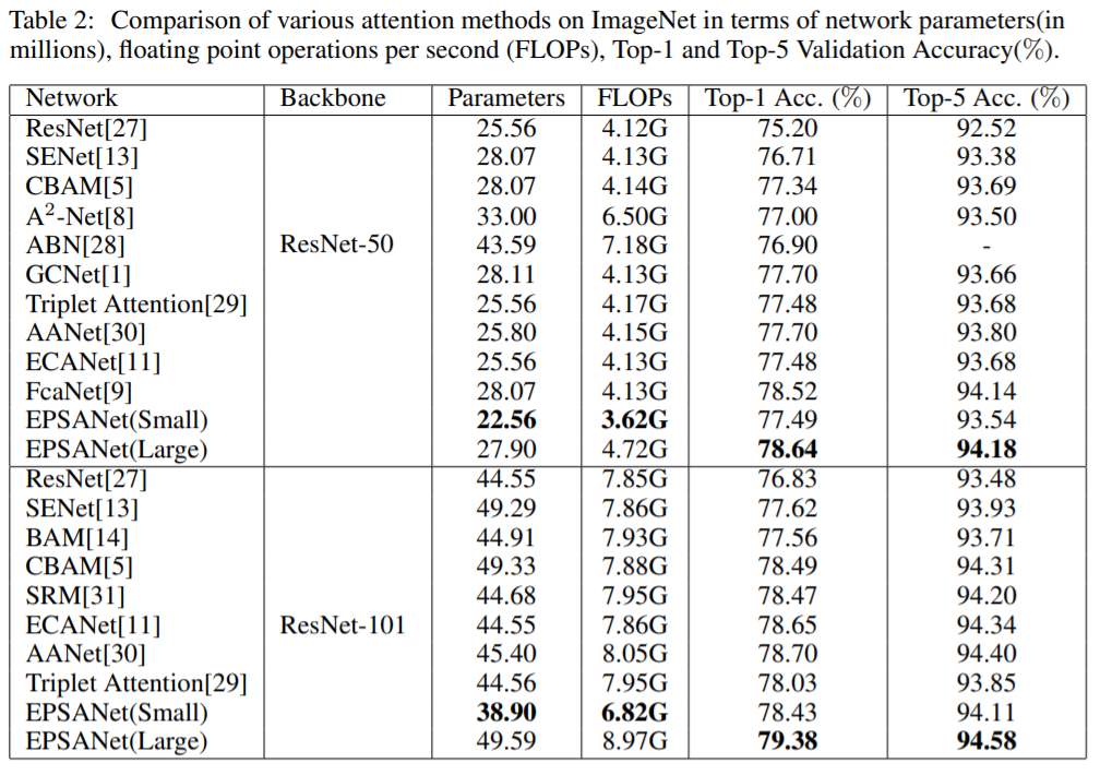 - The EPSANet-50(LARGE) can achieve the best performance compared with the other attention methods