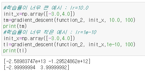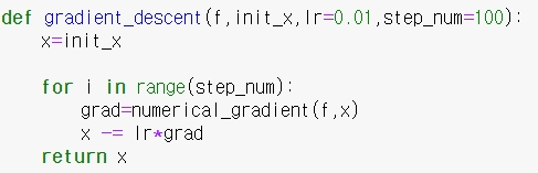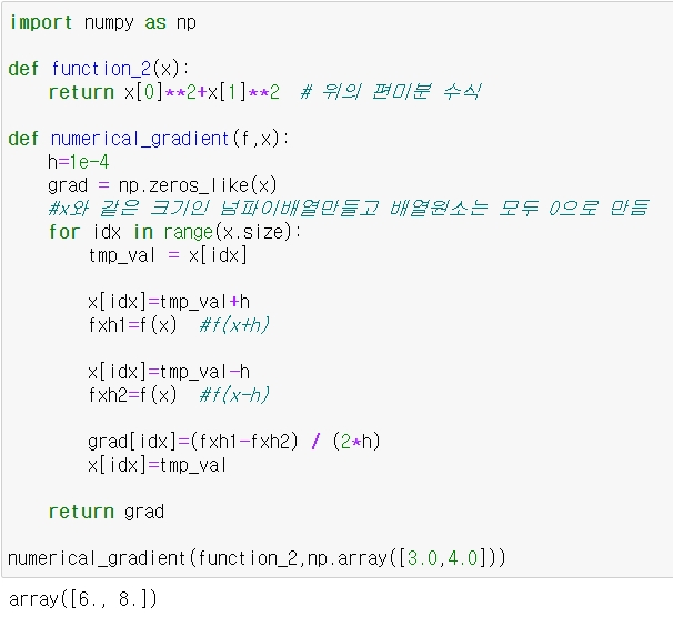 여기서 큰 틀인 numerical_gradient()함수와 이 함수안에 있는 numerical_gradient()함수는 매개변수 갯수가 다르므로 서로 다른 함수입니다.