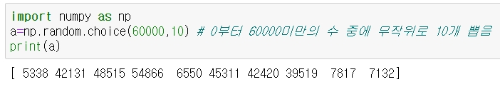 batch_mask = np.random.choice(train_size, batch_size)# 0부터59999중 랜덤으로 100개 뽑기