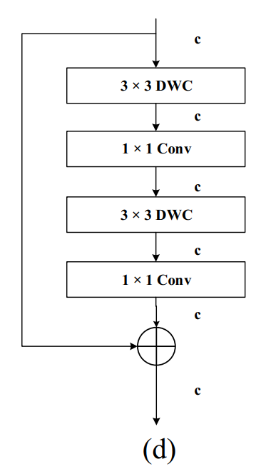 - Feature maps의 수를 변경하기 위해 point-wise convolution을 사용하는 것을 선호하는 최신 진보된 경령화 기법과 다르게 설계