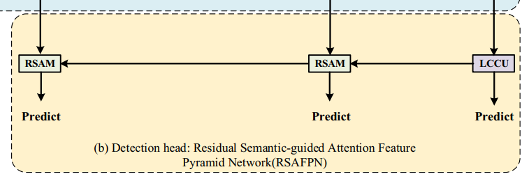 - (b) Residual Semantic-gudied Attention Feature Pyramid Network (RSAFPN) as detection head