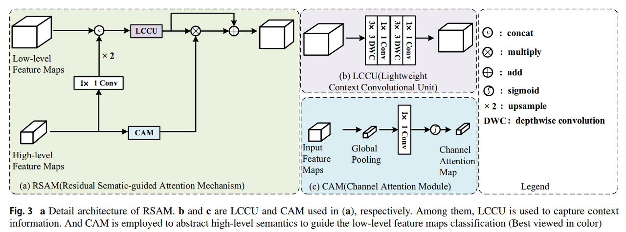 - LCNet*으로 부터의 multi-scale features를 fuse하는 Residual Semantic-guided Attention Mechanism (RSAM)을 이용함