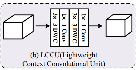 - Fig. 3b에 보이듯이 LCCU에서 두 개의 3x3 depthwise convolution을 채택하여 context 정보를 잡아내도록 함