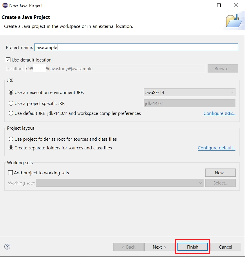 project name 부분에 프로젝트의 이름을 입력 후 [Finish]
