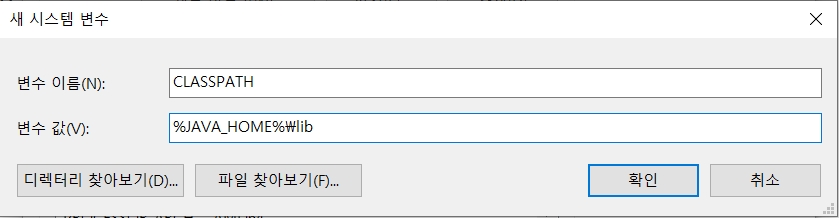 마지막으로 "CLASSPATH"라는 이름의 시스템 변수를 새로 생성합니다.