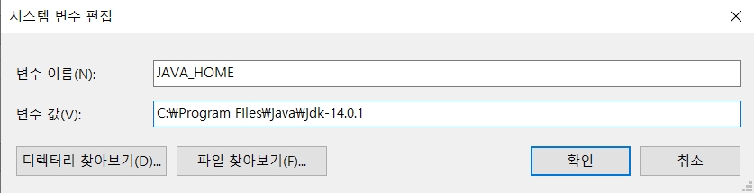 변수 값: C:\Program Files\java\jdk-14.0.1 (위에서 설치한 JDK의 경로를 적어주면 됩니다.)