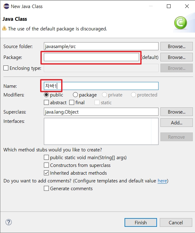 "Package"는 큰 프로그램을 만드는 경우에 여러 개의 클래스를 하나의 패키지로 만드는 경우에 사용되며 처음엔 각각의 클래스를 실행시켜야 하므로 칸을 비웁니다.