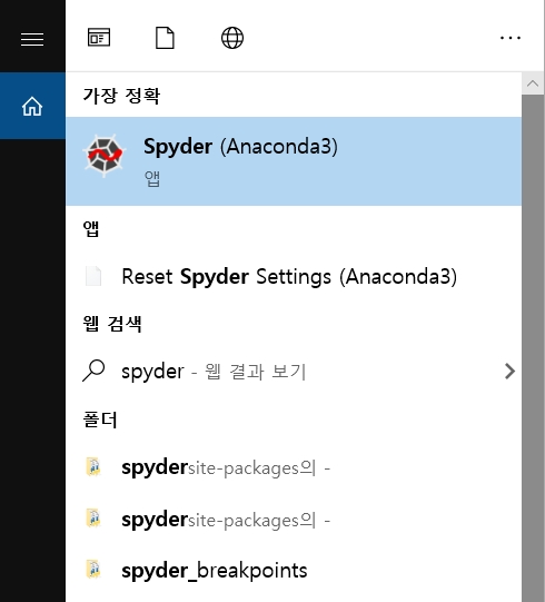 공식 홈페이지 설치와 마찬가지로 [시작] 메뉴 검색에 spyder 입력을 하면 다음과 같이 실행할 수 있습니다.
