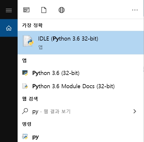 설치가 모두 완료가 되고 윈도우 [시작]메뉴 검색에 "python"을 검색하면 위의 그림과 같이 IDLE(Python 3.6 32-bit)과