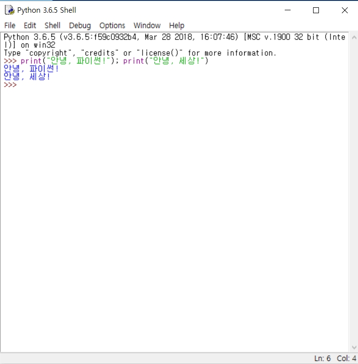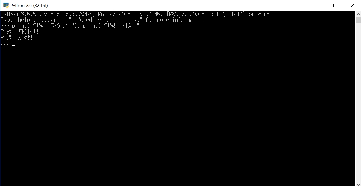 Python 3.6(32-bit) 실행 시 아래 사진과 같이 윈도우 cmd창과 비슷한 환경에서 파이썬을 프로그래밍할 수 있습니다.