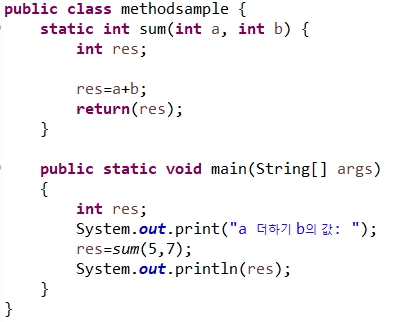 반환하는 return의 변수 res가 int 형이므로 메소드를 정의할 때 int로 정의하였고 메소드가 인수 두 개를 받으므로 그에 맞게 값을 넣어서 실행하였습니다.