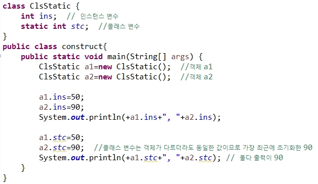 반면, 클래스 변수는 객체마다 생성되는 것이 아니라 클래스에 한 개만 존재하는 변수입니다.
