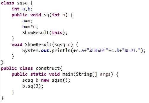 ShowResult 메서드는 sqsq클래스를 객체로 가진 변수를 인수로 가지기 때문에 sq 메소드에서 ShowResult를 부를 때 객체 값을 넣어야 하는데 이때 자기 자신 객체를 의미하는 this를 사용해서 값을 출력할 수 있습니다.