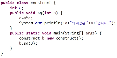 construct 클래스에서 멤버 변수 a와 메소드 sq의 인수 a가 같아서 다음과 같은 문제점이 발생합니다.