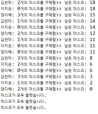 처음에 총 마스크 개수는 20개고 사람 당 최대 3개를 살 수 있도록 random 값을 설정했습니다.