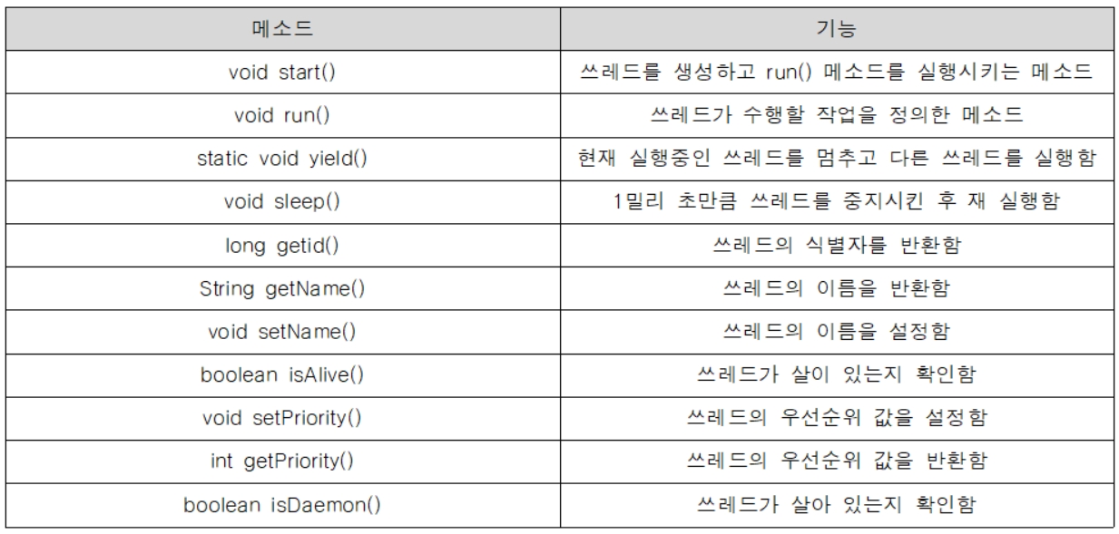다음 표는 Thread 클래스의 주요 메소드입니다.