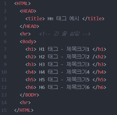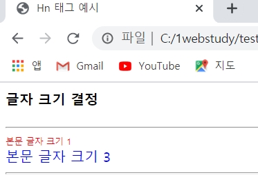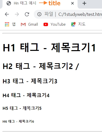 <Hn>태그는 <H1> ~ <H6> 6단계로 표기 가능하며 숫자가 작을 수록 글씨 크기가 큽니다.