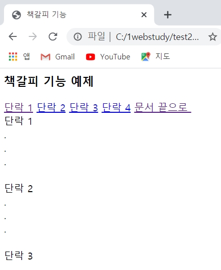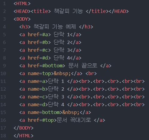 책갈피를 사용하려면 <a> 태그의 HREF 속성을 이용하여 하이퍼링크를 설정하고, <a> 태그의 NAME 속성을 이용하여 책갈피의 위치를 설정해야 합니다.