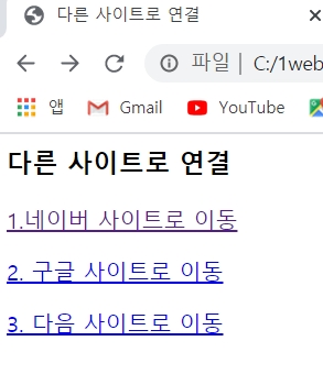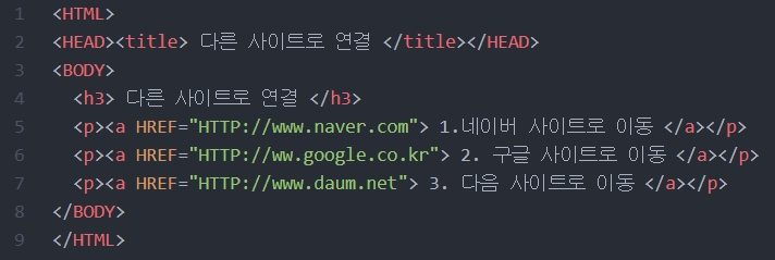 <A> : Anchor의 약자로 다른 문서, 그림 파일, 음악 파일에 연결할 때 사용되며 다른 홈페이지로 이동할 수 있습니다.