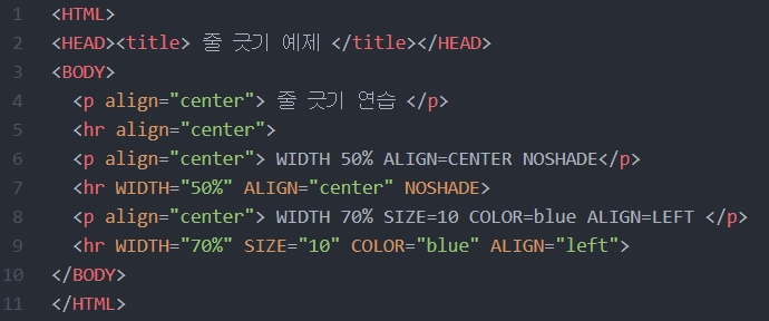 <HR SIZE=n WIDTH=n(%) COLOR="#색상코드" ALIGN="Left, Center, Right" NOSHADE>