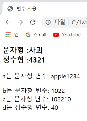 document.write("b는 문자형 변수: "+b+"<br>c는 문자형 변수: "+c+"<br>");