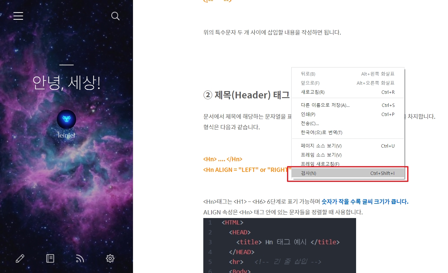 아무 웹페이지에서 마우스 오른쪽 클릭을 하고 검사를 누릅니다.