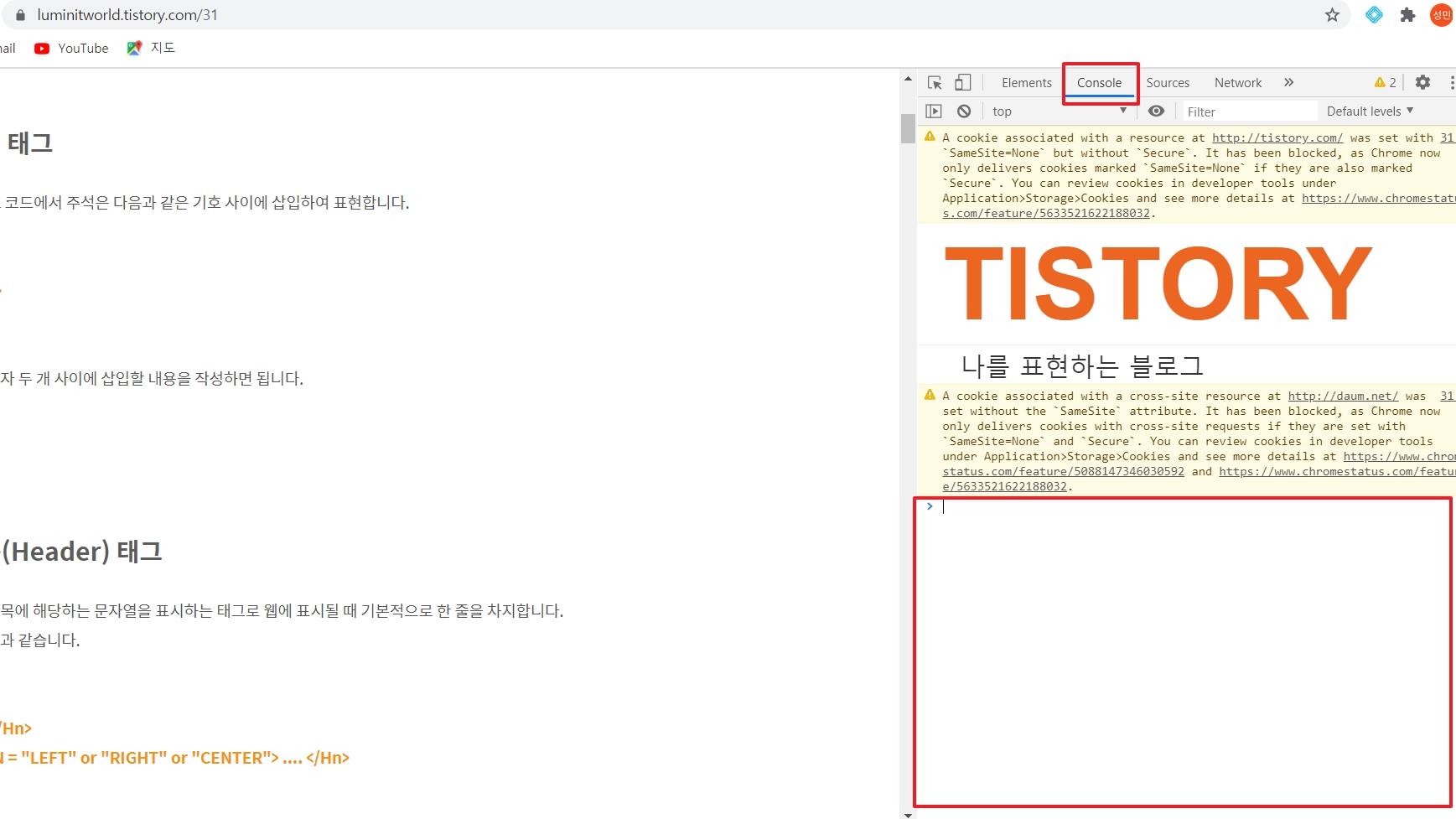 이 콘솔창에서 해당 웹페이지에 간단한 동작을 취할 수 있습니다.